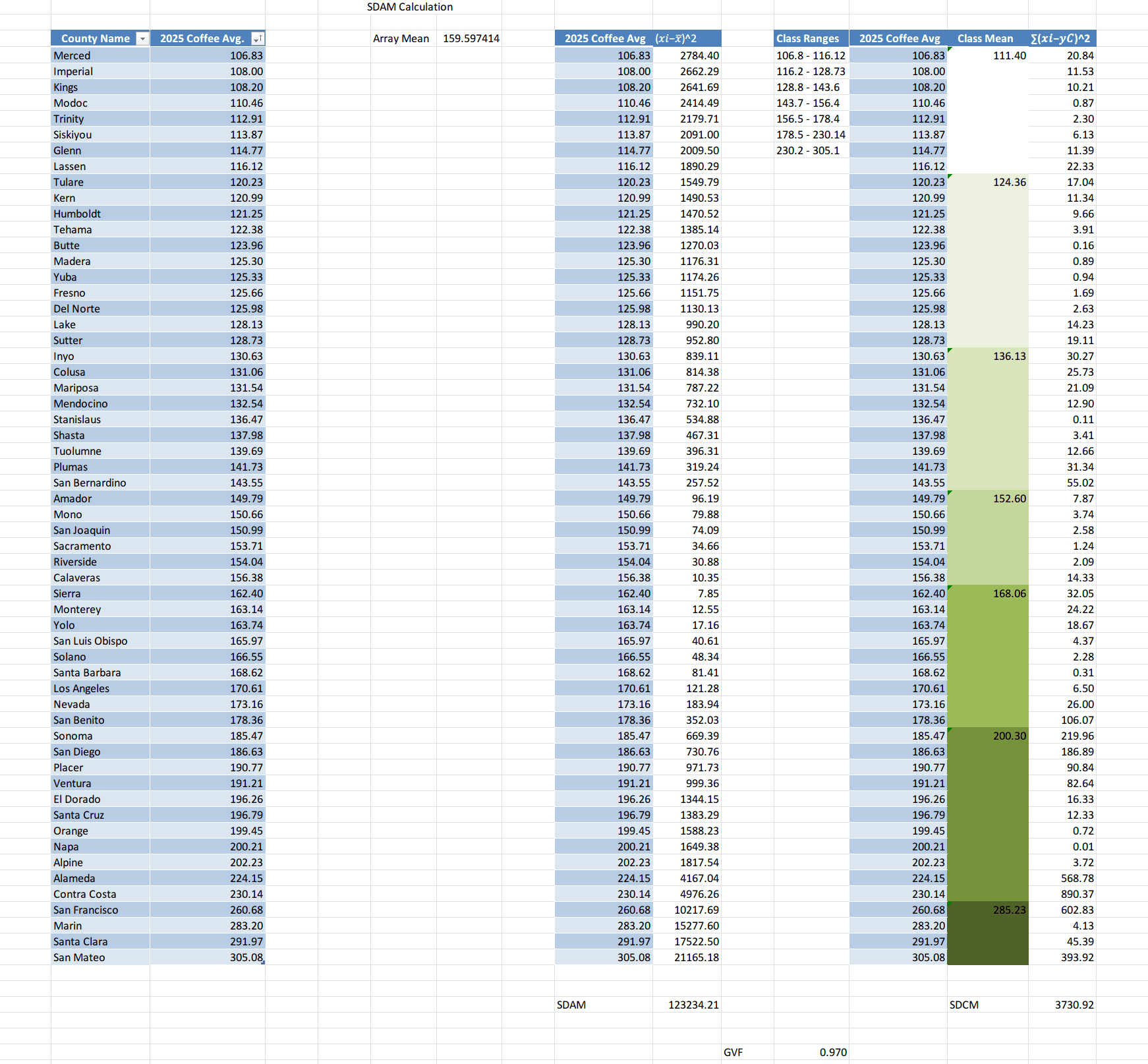 The data was collected using the Enrich tool build into ArcGIS Pro, and is categorized as: Average Household Spending on Coffee. The data represents spending in the year 2025 and was aggregated at the County level.